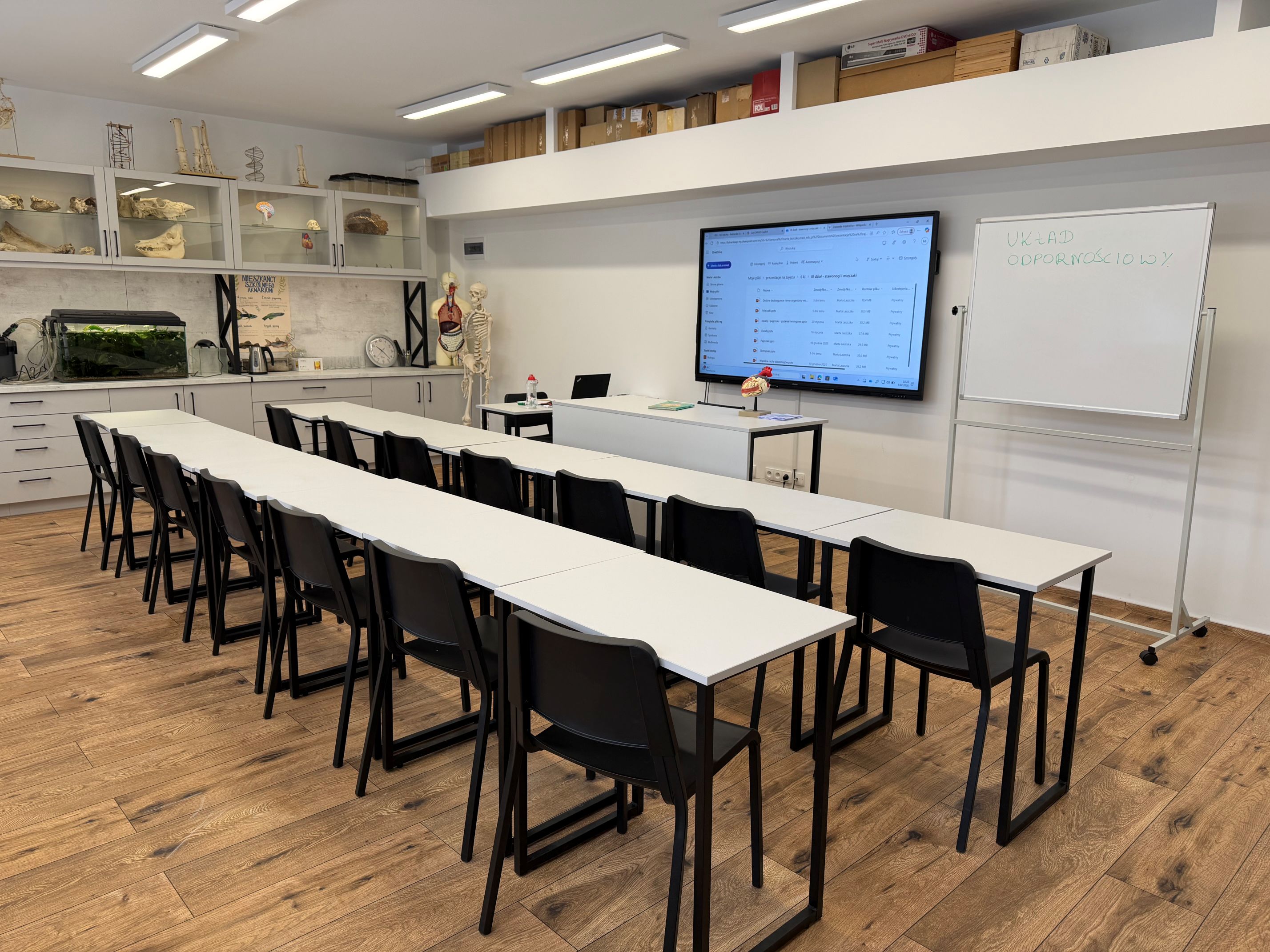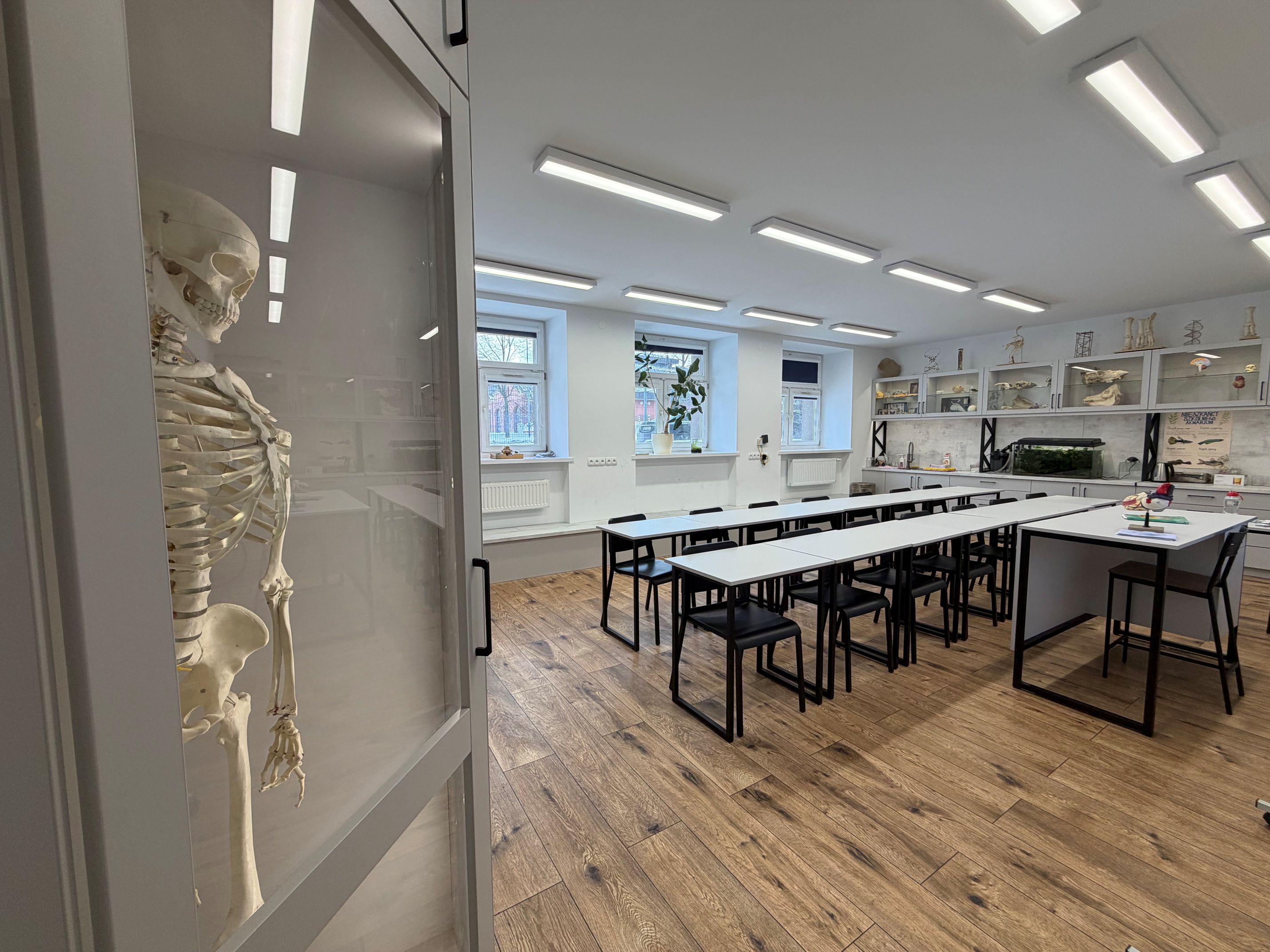 Wyremontowaliśmy pracownię biologiczną, kto nie widział zapraszam gorąco - jest na co popatrzeć! Jest czysta, nowoczesna, mam nadzieję, że dzieciom przyjemnie i komfortowo się tam pracuje. Szkielety mają swoją elegancką gablotę, pomoce naukowe są wyeksponowane w podświetlanych witrynach a podwodny świat można oglądać w nowym akwarium. Zamontowaliśmy nowoczesną multimedialną tablicę, która daje ogromne możliwości uatrakcyjnienia lekcji!